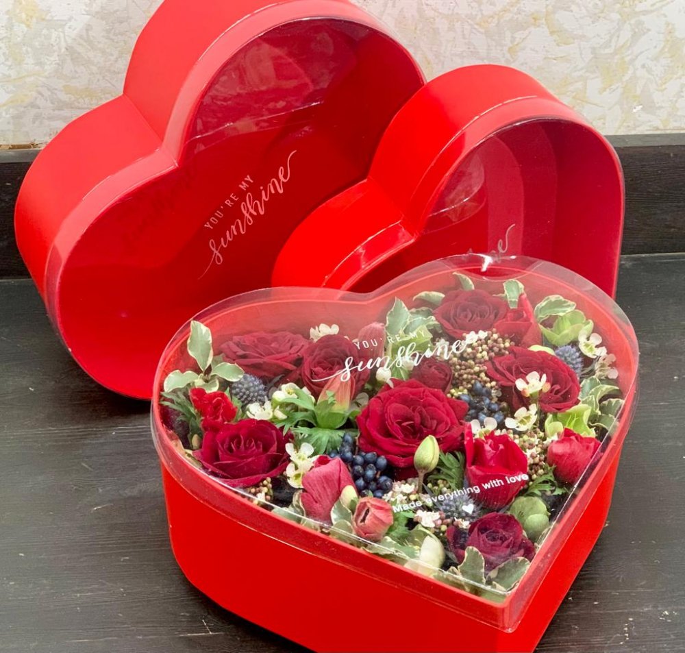 Flower box a cuore rossa con copertura trasparente in cellophane